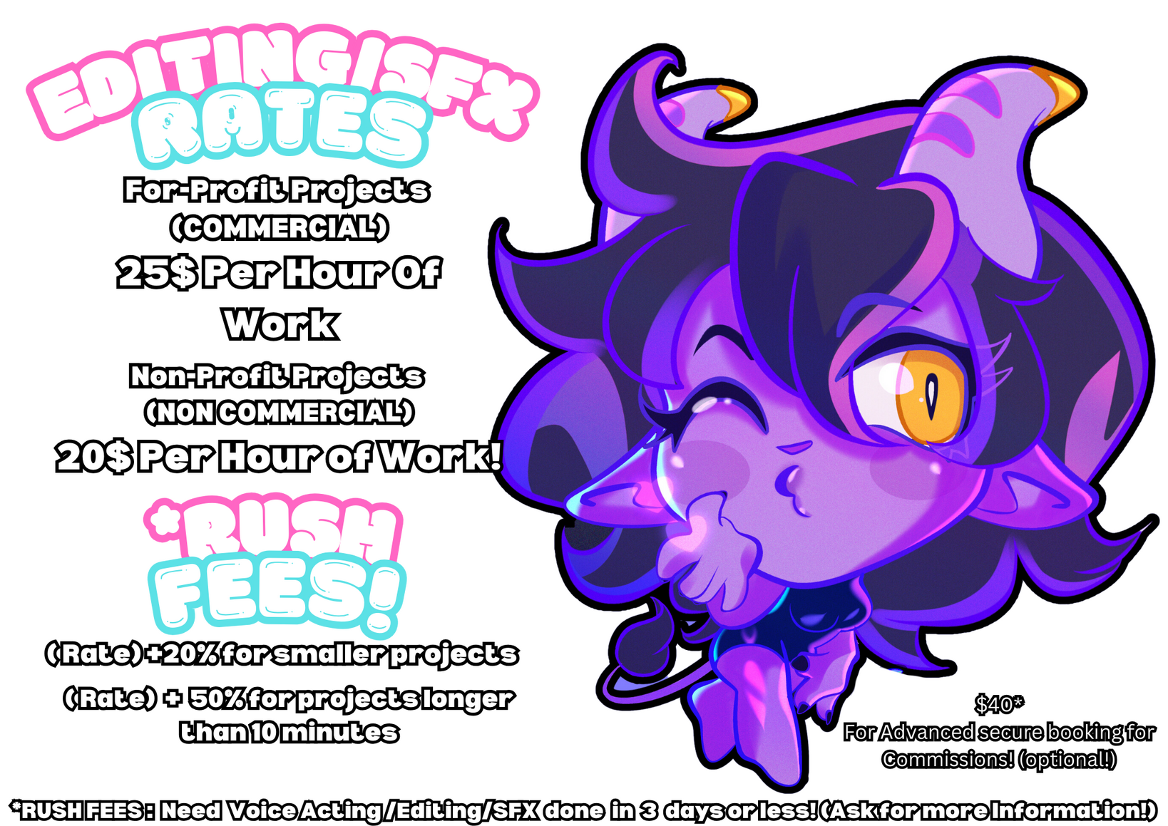 Providing services for video games, audio stories, animations, and so much more! My services are open to indie, professional, and private clientele.✧ Commercial + Private Commission